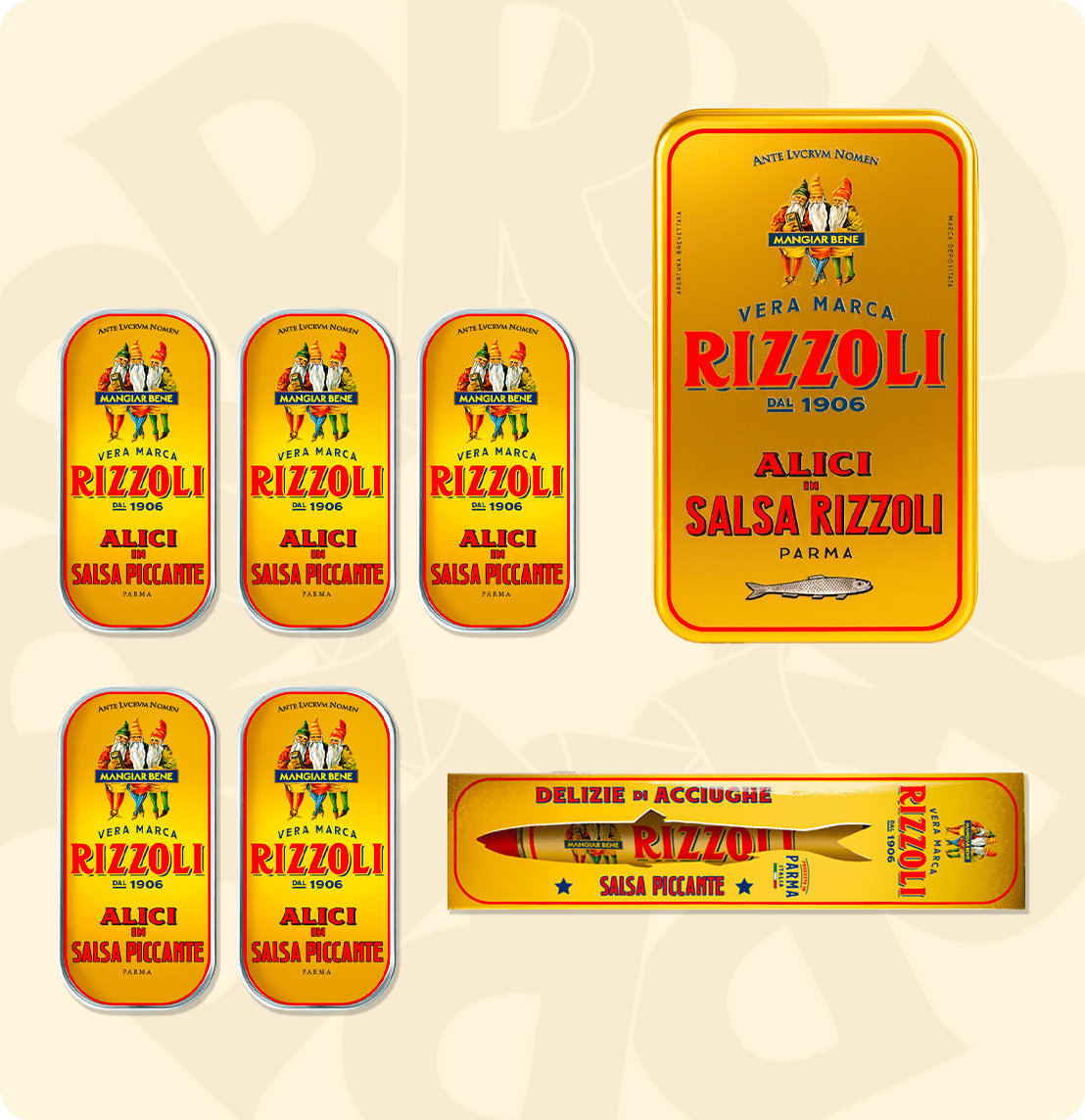 Cinque iconiche lattine di Alici in Salsa Rizzoli e una Delizie in Salsa Rizzoli racchiudono il nostro segreto: la ricetta tramandata solo a voce da cinque generazioni. Ancora oggi ogni passaggio continua ad essere svolto artigianalmente, con cura e passione, nel rispetto dell’antica tradizione di famiglia.